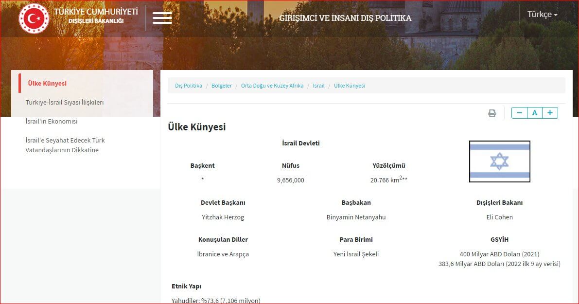 Dışişleri Bakanlığı internet sitesinin güncel hâlinde ne İsrail’in başkentinin Kudüs olduğunu kabul ediliyor ne de internet sitesinde bu yönde bir bilgi sunuluyor.