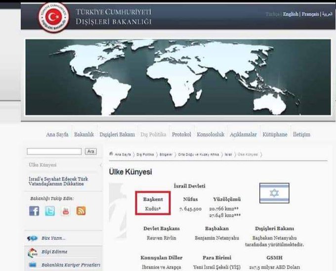 Dışişleri Bakanlığı internet sitesindeki İsrail ülke künyesinde İsrail’in başkenti bölümünde 2012 yılında bir açıklama notu ile “Kudüs*” ifadesi yer alıyormuş. Daha sonra “Kudüs” silinerek sadece “*” işareti ile Türkiye’nin Kudüs’ün başkentliği hususundaki pozisyonu aktarılmış.
