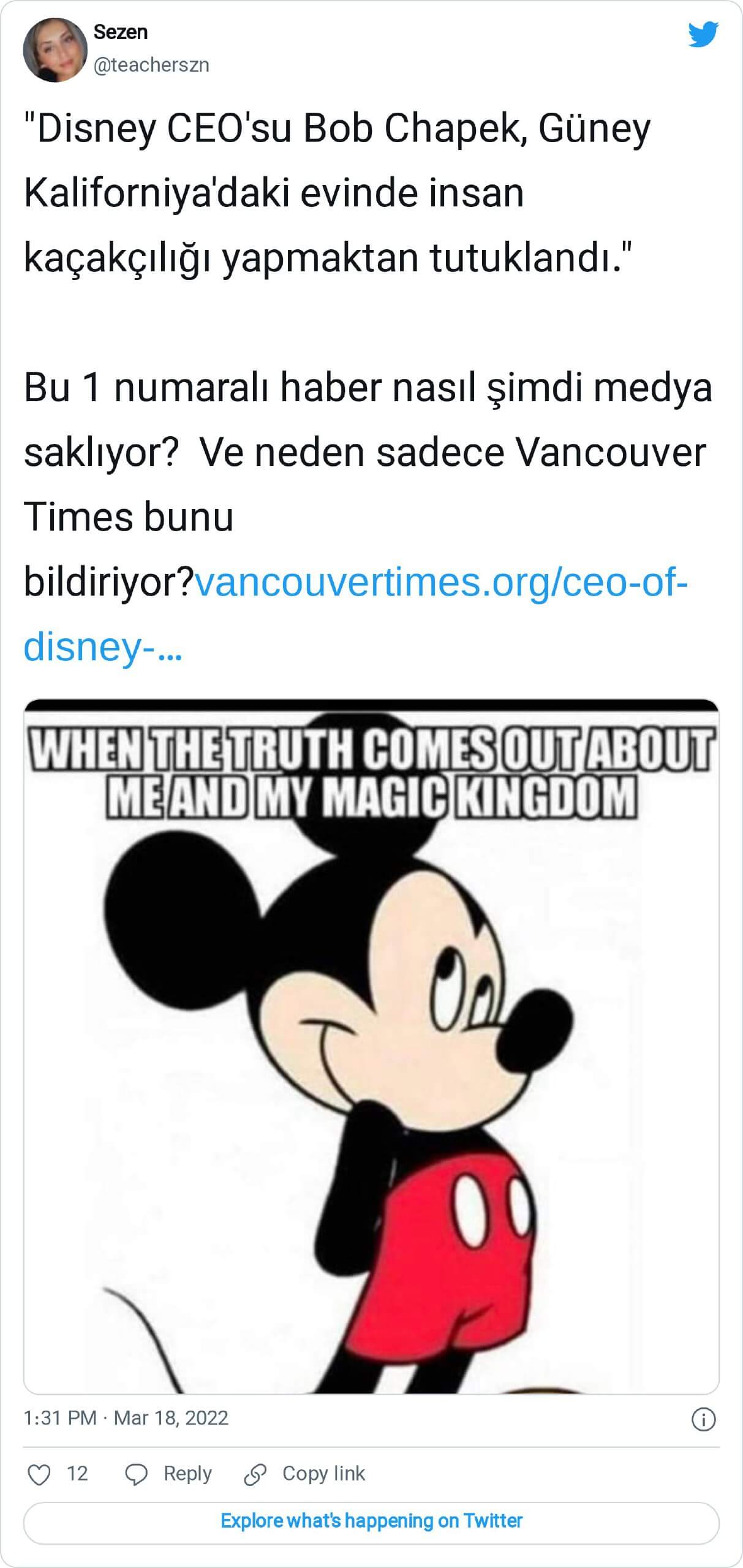 “Disney CEO’su Bob Chapek, Güney Kaliforniya’daki evinde insan kaçakçılığı yapmaktan tutuklandı.” Bu 1 numaralı haber nasıl şimdi medya saklıyor? Ve neden sadece Vancouver Times bunu bildiriyor?  https://vancouvertimes.org/ceo-of-disney-arrested-for-human-trafficking/”