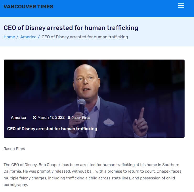 Paylaşılan iddiaya, Vancouver Times’ta 17 Mart 2022 tarihinde yayımlanan “Disney CEO’su insan kaçakçılığından tutuklandı” (“CEO of Disney arrested for human trafficking“) başlıklı yazıda yer verilmişti.