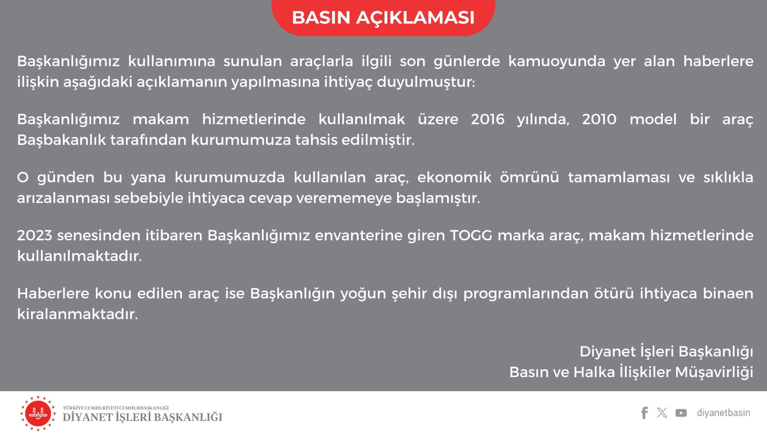 “Başkanlığımız kullanımına sunulan araçlarla ilgili son günlerde kamuoyunda yer alan haberlere ilişkin aşağıdaki açıklamanın yapılmasına ihtiyaç duyulmuştur:
