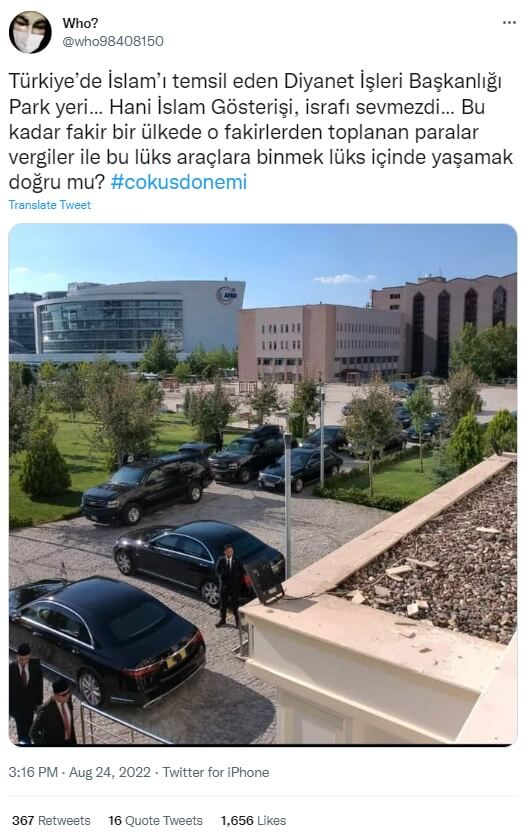 Türkiye’de İslam’ı temsil eden Diyanet İşleri Başkanlığı Park yeri… Hani İslam Gösterişi, israfı sevmezdi… Bu kadar fakir bir ülkede o fakirlerden toplanan paralar vergiler ile bu lüks araçlara binmek lüks içinde yaşamak doğru mu? #cokusdonemi