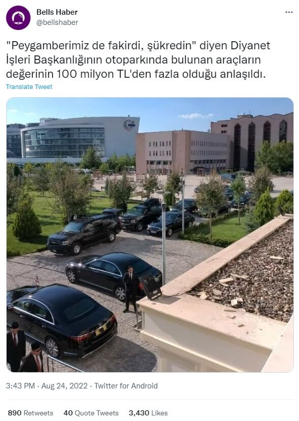 “”Peygamberimiz de fakirdi, şükredin” diyen Diyanet İşleri Başkanlığının otoparkında bulunan araçların değerinin 100 milyon TL’den fazla olduğu anlaşıldı.”