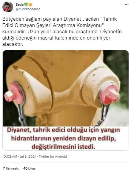 Diyanet, yangın hidrantı hakkında “tahrik” konulu bir yorum yapmış ya da herhangi bir yeniden tasarım isteğinde bulunmuş değil.