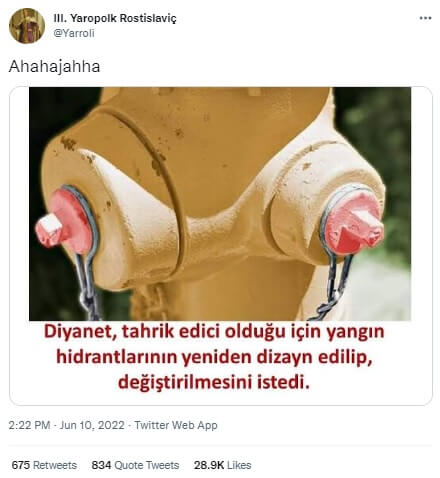 30 Nisan 2006 tarihinde Deviantart.com’a yüklenen yangın hidrantı fotoğrafına “Diyanet, tahrik edici olduğu için yangın hidrantlarının yeniden dizayn edilip, değiştirilmesini istedi.” notunun eklendiği görsel, bazı sosyal medya kullanıcıları tarafından gerçek sanılmış.