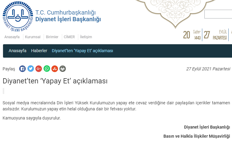 “Özellikle belirtmek isterim ki, Diyanet İşleri Başkanlığı Din İşleri Yüksek Kurulu’nun “Yapay et helaldir” şeklinde bir fetvası yoktur. Aktardığım görüşler bilimsel bir toplantıda tartışılan ve fıkıh uzmanlarınca yapay etin helal olup olmamasını belirleyen fıkhi kurallardır.”