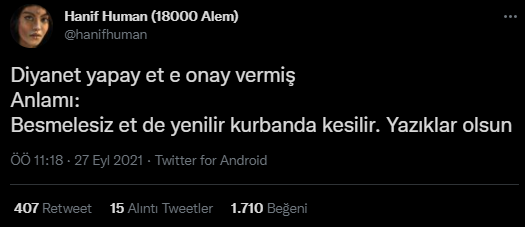 “Diyanet yapay et e onay vermiş Anlamı: Besmelesiz et de yenilir kurbanda kesilir. Yazıklar olsun”