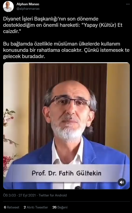 “Diyanet İşleri Başkanlığı’nın son dönemde desteklediğim en önemli hareketi: “Yapay (Kültür) Et caizdir.” Bu bağlamda özellikle müslüman ülkelerde kullanım konusunda bir rahatlama olacaktır. Çünkü istemesek te gelecek buradadır.”