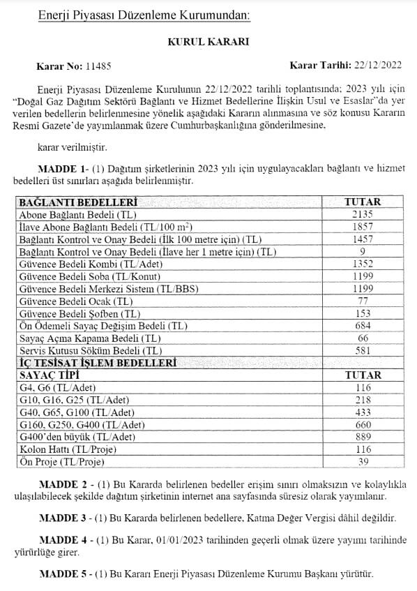 EPDK’nın 24 Aralık 2022 günü Resmî Gazete’de yayımlanan bu kararı, Doğal Gaz Dağıtım Sektörü Bağlantı ve Hizmet Bedellerine İlişkin Usul ve Esaslar‘da yer verilen bedellerin yaklaşık % 84 artırılmasına yönelik. Doğal gaz metreküp satış fiyatının artırılmasına dair değil.