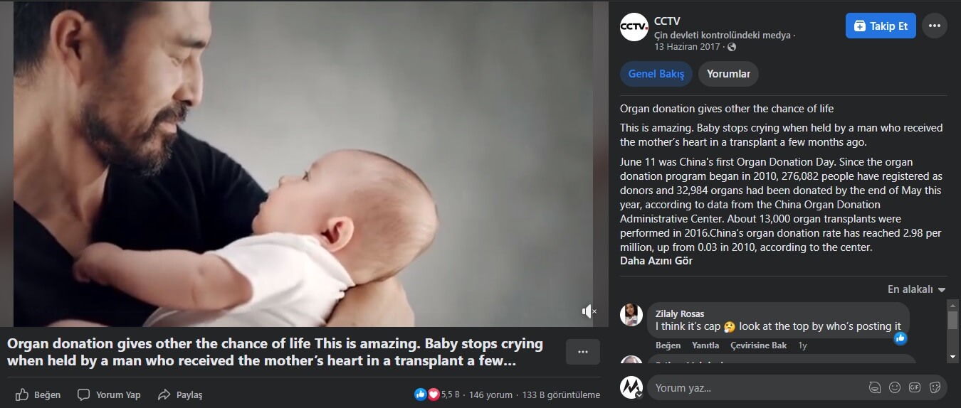 “Organ bağışı başkalarına yaşam şansı verir Bu harika. Bebek, birkaç ay önce annesinden kalp nakli yapılan bir adam tarafından tutulduğunda ağlamayı kesiyor. 11 Haziran, Çin’in ilk Organ Bağış Günüydü. Çin Organ Bağışı İdari Merkezi’nin verilerine göre, organ bağışı programının başladığı 2010 yılından bu yana 276.082 kişi bağışçı olarak kayıt yaptırdı ve bu yılın Mayıs ayı sonuna kadar 32.984 organ bağışlandı. 2016 yılında yaklaşık 13.000 organ nakli gerçekleştirildi. Merkeze göre, Çin’in organ bağışı oranı 2010’da 0,03’ten milyonda 2,98’e ulaştı.”