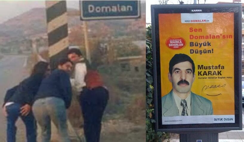 2009 yerel seçimleri sürecinde AK Parti tarafından kullanılan “Sen Türkiyesin Büyük Düşün” sloganının yer aldığı AK Parti Üsküdar Belediye Başkan Adayı Mustafa Kara’nın adaylık tanıtımına kimliği tespit edilemeyen bir kişinin fotoğrafı eklenmiş. 2009-2014 yılları arasında Üsküdar Belediye Başkanlığı yapan Mustafa Kara’nın adı Mustafa Karak’a dönüştürülmüş. Üsküdar da Domalan’a çevrilmiş.