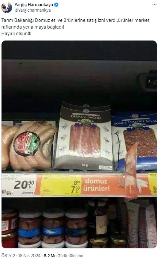 Yargıç Harmankaya (@Yargicharmankya): “Tarım Bakanlığı Domuz eti ve ürünlerine satış izni verdi,ürünler market raflarında yer almaya başladı! Hayırlı olsun!!!”