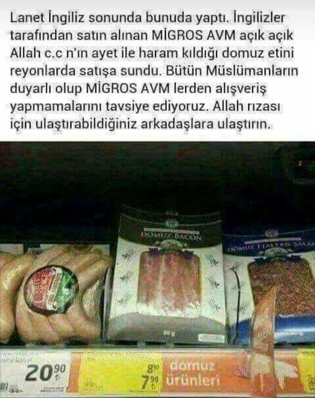 Bircan Yıldırım (@BRCNYLDRMB): “Müjde! Tarım Bakanlığı Domuz eti ve ürünlerine satış izni verdi,ürünler market raflarında yer almaya başladı! Müslüman mahallesinde domuz eti satıyorlar hemde siyasal islamla yönetilen ülkede.”