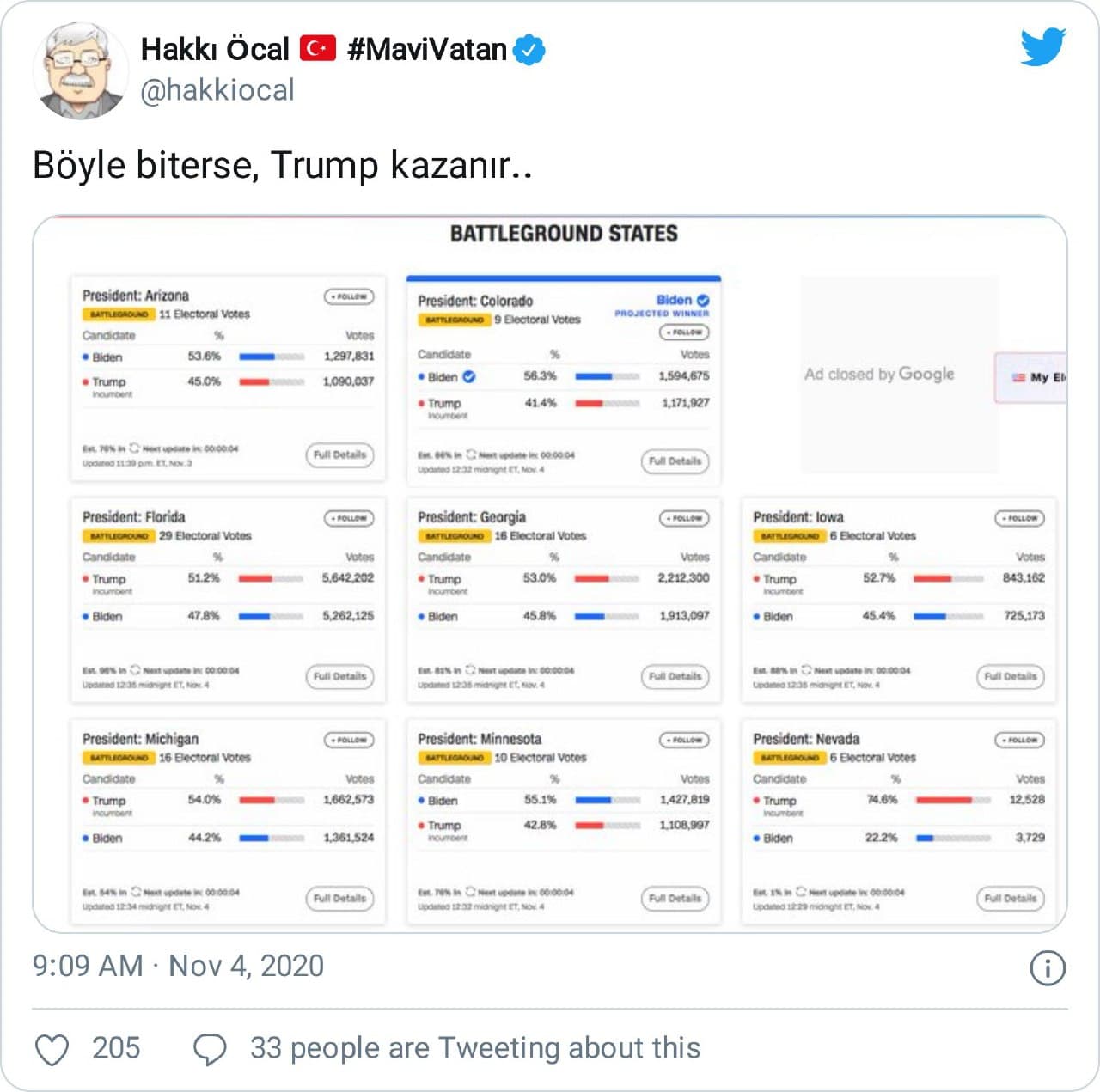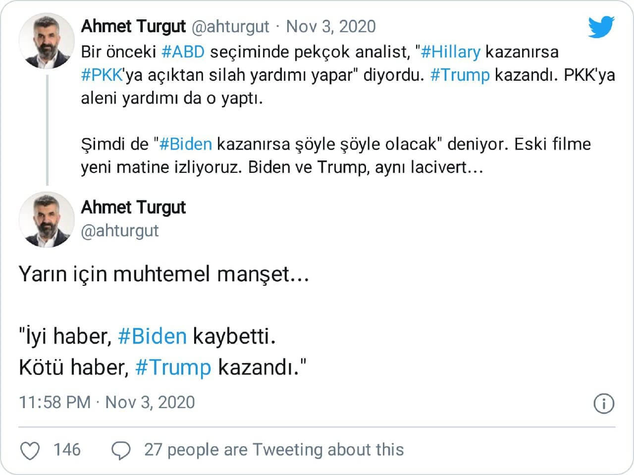 Ahmet Turgut: “Yarın için muhtemel manşet… “İyi haber, #Biden kaybetti. Kötü haber, #Trump kazandı.“”