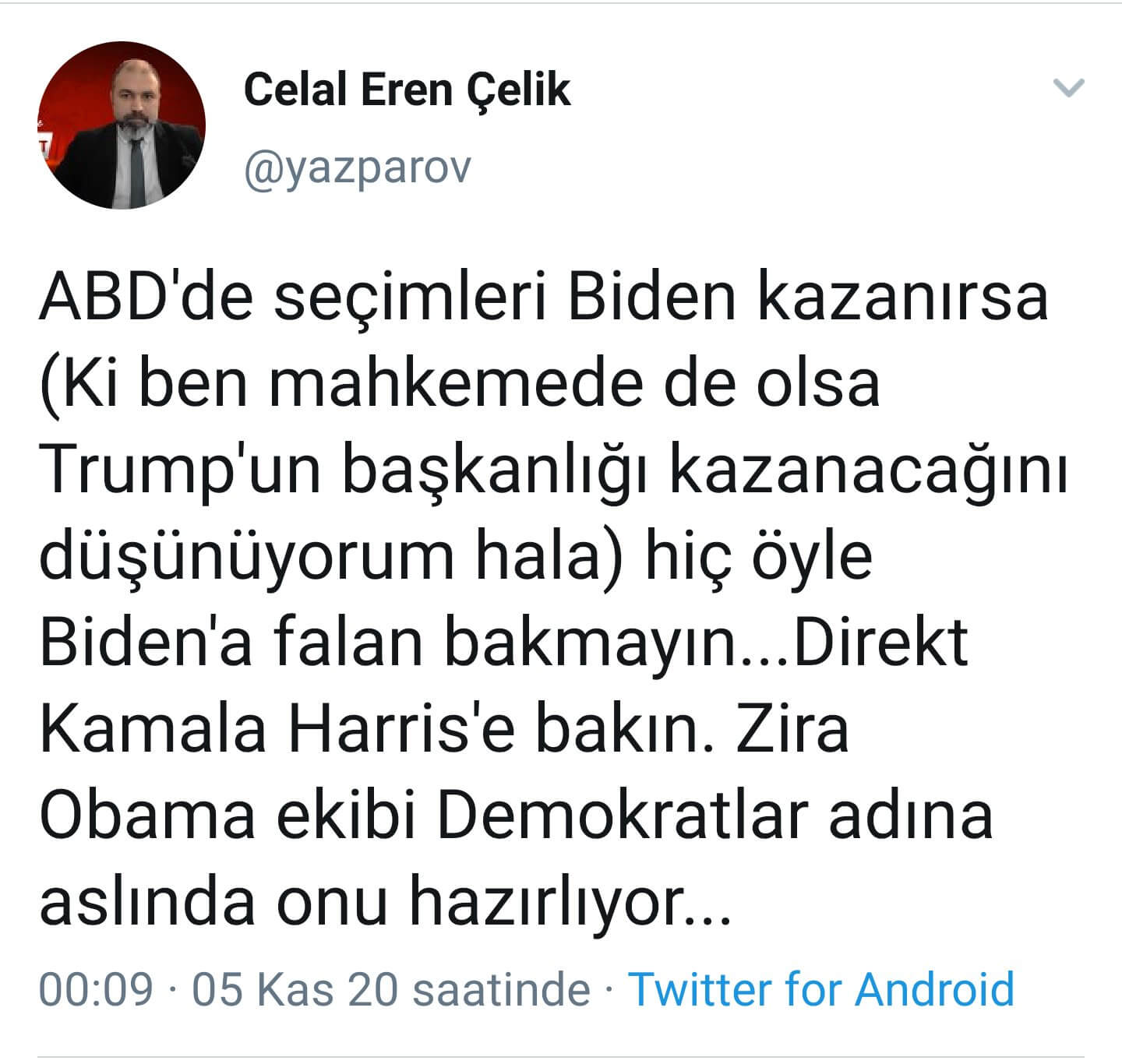 Celal Eren Çelik: “ABD’de seçimleri Biden kazanırsa (Ki ben mahkemede de olsa Trump’un başkanlığı kazanacağını düşünüyorum hala) hiç öyle Biden’a falan bakmayın…Direkt Kamala Harris’e bakın. Zira Obama ekibi Demokratlar adına aslında onu hazırlıyor…”