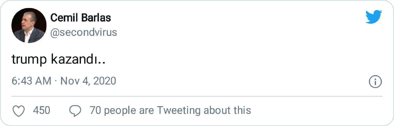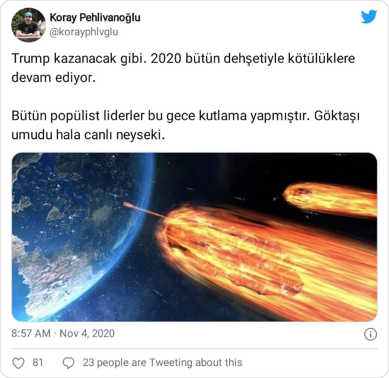 Koray Pehlivanoğlu: “Trump kazanacak gibi. 2020 bütün dehşetiyle kötülüklere devam ediyor. Bütün popülist liderler bu gece kutlama yapmıştır. Göktaşı umudu hala canlı neyseki.”