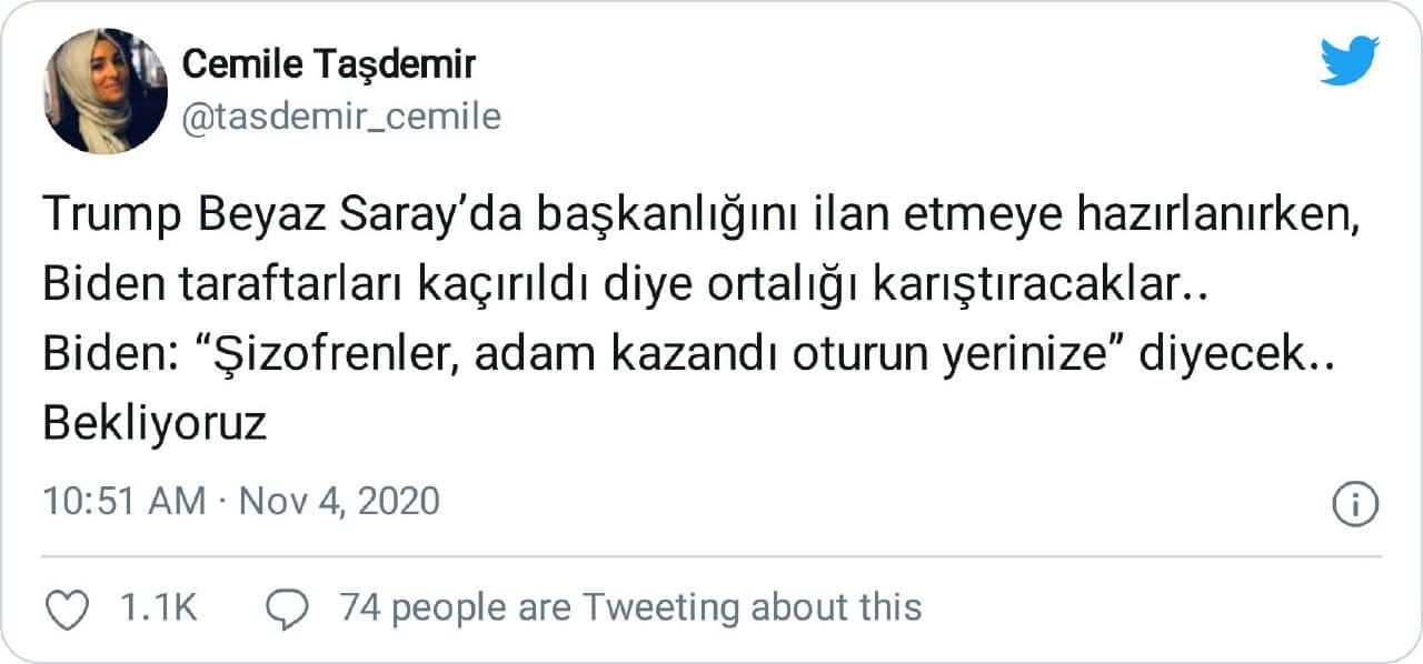 Cemile Taşdemir: “Trump Beyaz Saray’da başkanlığını ilan etmeye hazırlanırken, Biden taraftarları kaçırıldı diye ortalığı karıştıracaklar.. Biden: “Şizofrenler, adam kazandı oturun yerinize” diyecek.. Bekliyoruz”