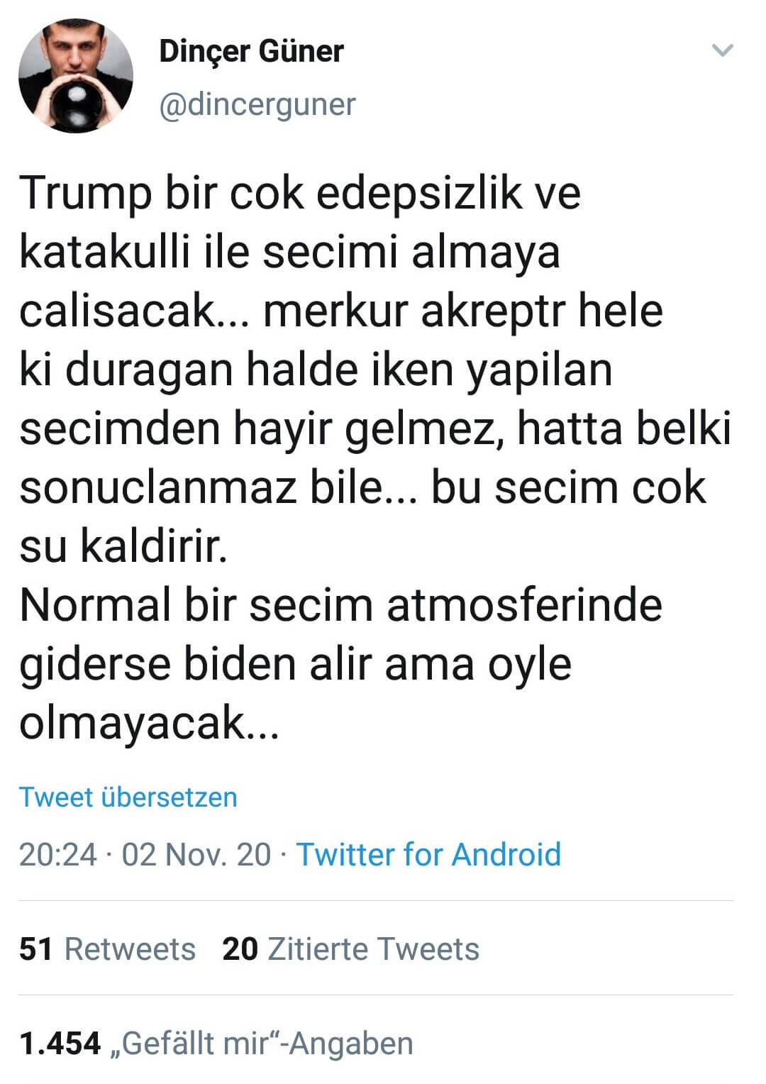 Dinçer Güner: “Trump bir çok edepsizlik ve katakulli ile seçimi almaya çalışacak… merkür akreptr hele ki duragan halde iken yapilan secimden hayir gelmez, hatta belki sonuclanmaz bile… bu secim cok su kaldirir. Normal bir secim atmosferinde giderse biden alir ama oyle olmayacak”