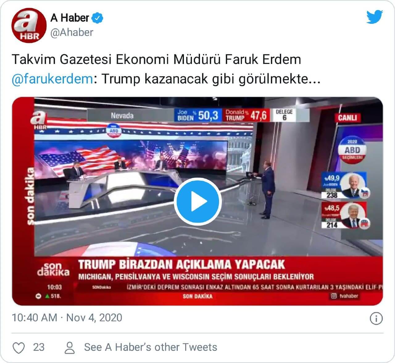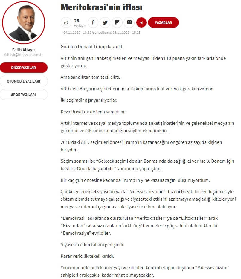 Fatih Altaylı: “Görülen Donald Trump kazandı. ABD’nin anlı şanlı anket şirketleri ve medyası Biden’ı 10 puana yakın farklarla önde gösteriyordu. Ama sandıktan tam tersi çıktı.”