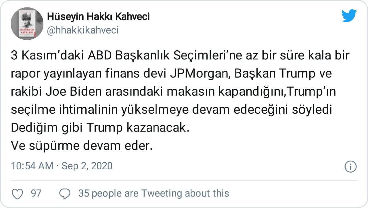 Hüseyin Hakkı Kahveci: “3 Kasım’daki ABD Başkanlık Seçimleri’ne az bir süre kala bir rapor yayınlayan finans devi JPMorgan, Başkan Trump ve rakibi Joe Biden arasındaki makasın kapandığını, Trump’ın seçilme ihtimalinin yükselmeye devam edeceğini söyledi Dediğim gibi Trump kazanacak. Ve süpürme devam eder.”
