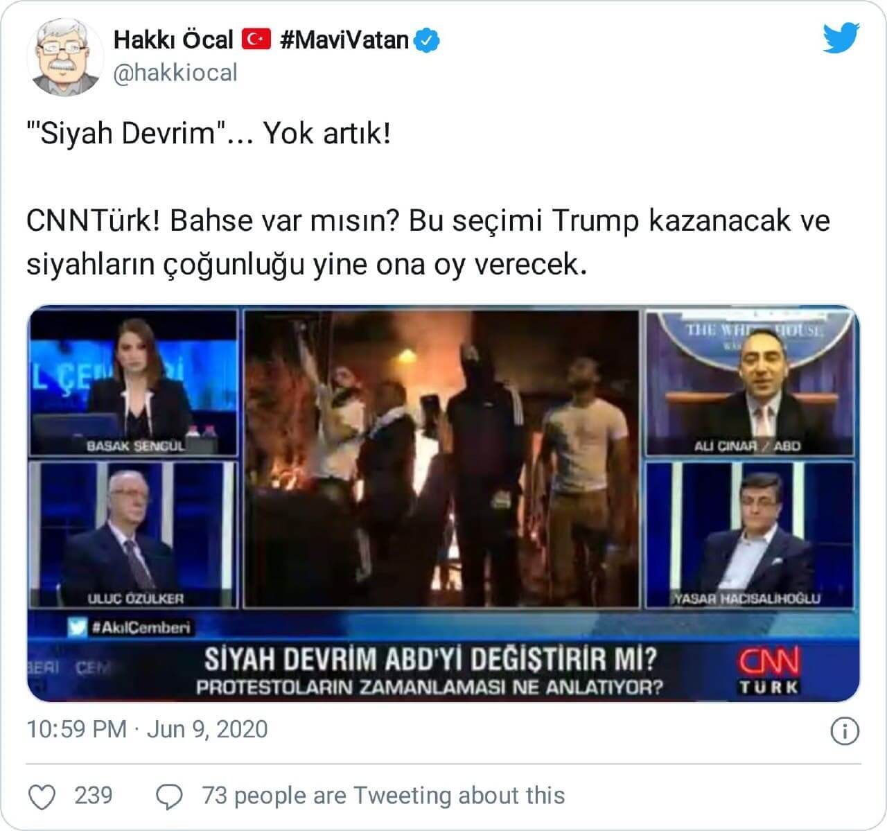 Hakkı Öcal: ““‘Siyah Devrim”… Yok artık! CNNTürk! Bahse var mısın? Bu seçimi Trump kazanacak ve siyahların çoğunluğu yine ona oy verecek.”