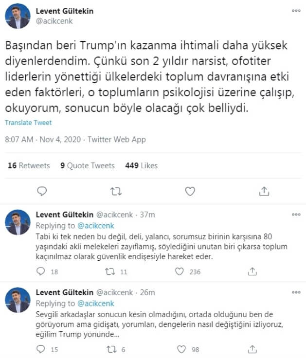 Levent Gültekin: “Başından beri Trump’ın kazanma ihtimali daha yüksek diyenlerdendim. Çünkü son 2 yıldır narsist, ofotiter liderlerin yönettiği ülkelerdeki toplum davranışına etki eden faktörleri, o toplumların psikolojisi üzerine çalışıp okuyorum, sonucun böyle olacağı çok belliydi.”