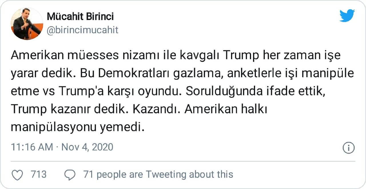 Mücahit Birinci: “Amerikan müesses nizamı ile kavgalı Trump her zaman işe yarar dedik. Bu Demokratları gazlama, anketlerle işi manipüle etme vs Trump’a karşı oyundu. Sorulduğunda ifade ettik, Trump kazanır dedik. Kazandı. Amerikan halkı manipülasyonu yemedi.”