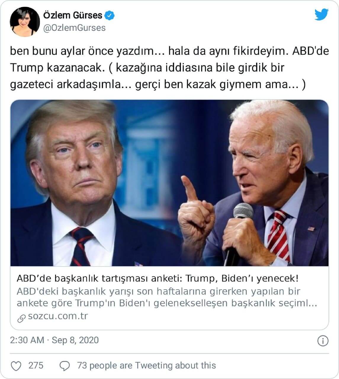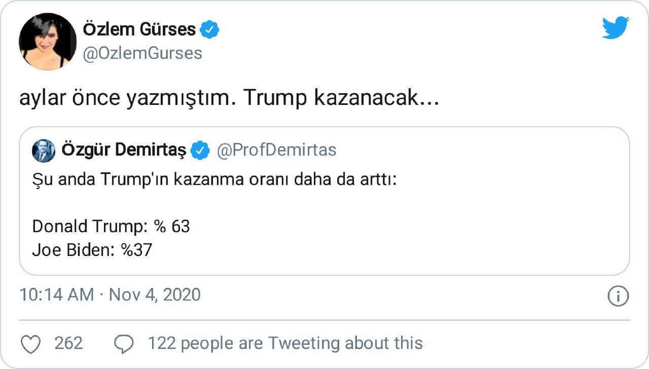 Özlem Gürses: “ben bunu aylar önce yazdım… hala da aynı fikirdeyim. ABD’de Trump kazanacak. ( kazağına iddiasına bile girdik bir gazeteci arkadaşımla… gerçi ben kazak giymem ama… )”