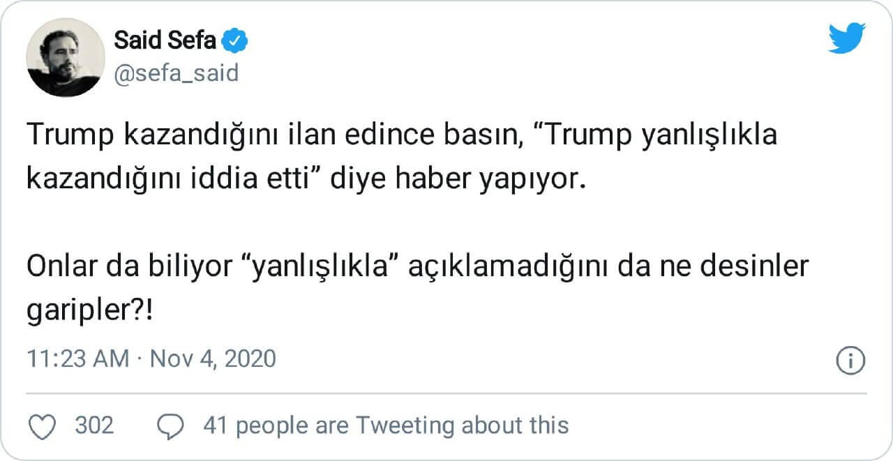 Said Sefa: “Trump kazandığını ilan edince basın, “Trump yanlışlıkla kazandığını iddia etti” diye haber yapıyor. Onlar da biliyor “yanlışlıkla” açıklamadığını da ne desinler garipler?!”