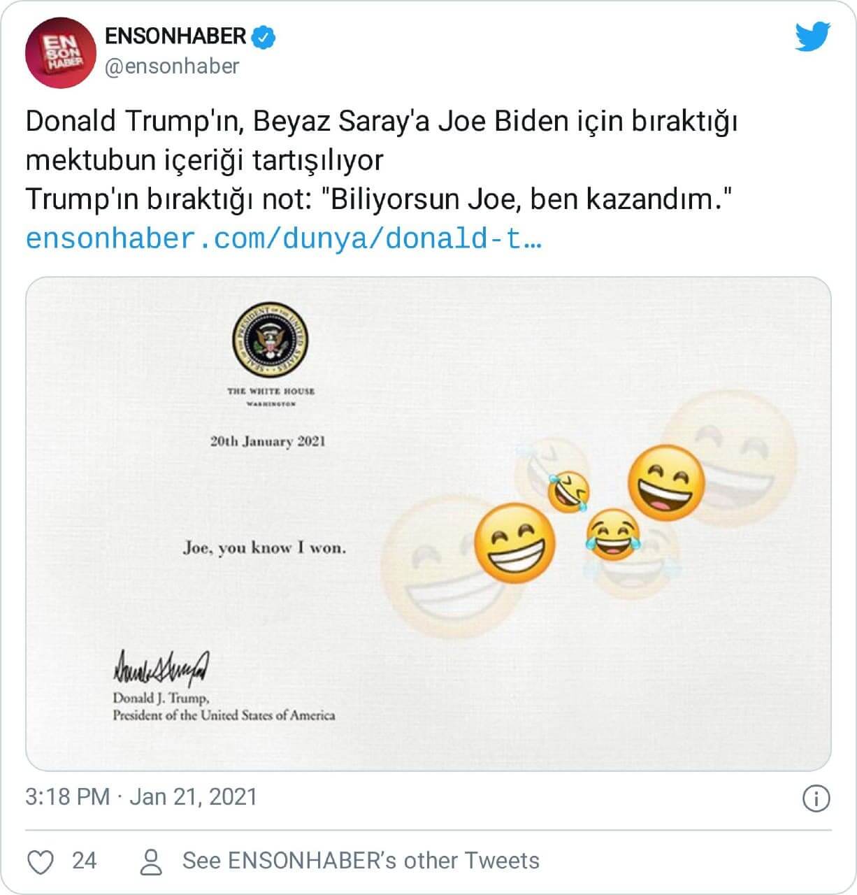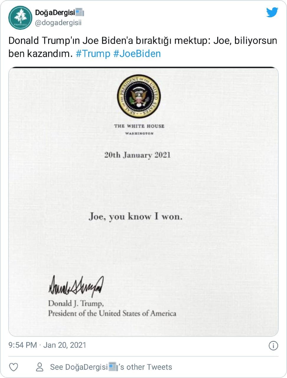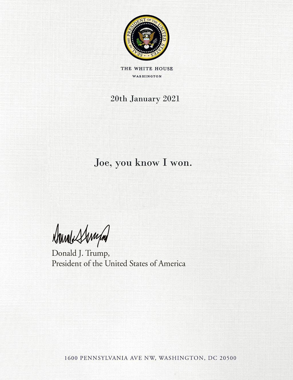 Donald Trump’ın halefi ABD Başkanı Joe Biden’a bıraktığı sanılan üzerinde “Joe, biliyorsun ben kazandım” cümlesini barındıran mektup görseli şu şekildeydi: