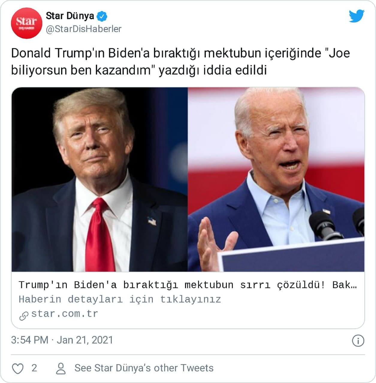 Donald Trump’ın da bu geleneğe uyarak Oval Ofis’ten ayrılırken halefine bir mektup bıraktığı biliniyor. ABD Başkanı Joe Biden içeriği merak edilen mektuba ilişkin basın temsilcilerine “Başkan, çok cömert bir mektup yazdı. Özel olduğu için onunla konuşana kadar mektup hakkında konuşmayacağım. Ama cömertti.” açıklamasında bulunmuştu. Beyaz Saray Basın Ofisi de Donald Trump’ın kendinden önceki başkanlarca izlenen geleneğe uygun şekilde Joe Biden’a hitaben kaleme aldığı bir notu Oval Ofis’teki masaya bıraktığını aktarmıştı.
