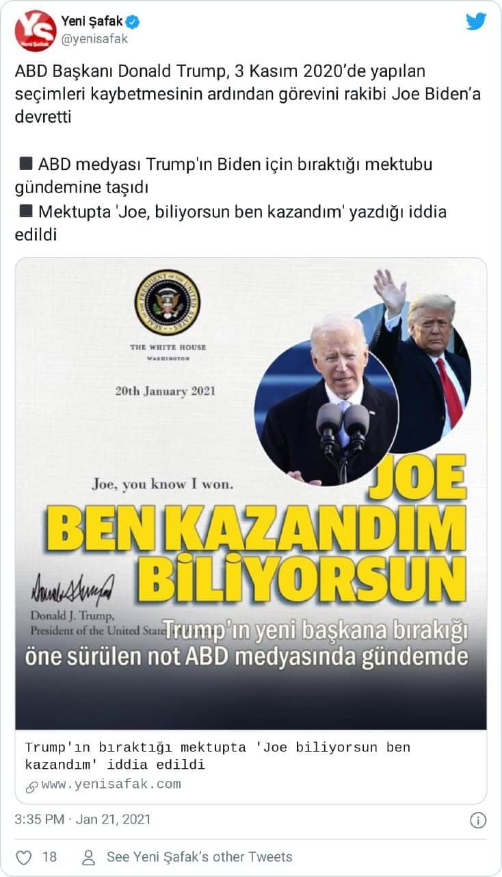ABD Başkanı Donald Trump, 3 Kasım 2020’de yapılan seçimleri kaybetmesinin ardından görevini halefi Joe Biden’a devretti. Joe Biden’ın 46. ABD Başkanı olarak yemin ettiği 20 Ocak 2021 günü, Donald Trump’ın rakibine bıraktığı iddia edilen mektup görseline sosyal medyada ve haber sitelerinde gerçek sanılarak yaygın şekilde yer verildi.