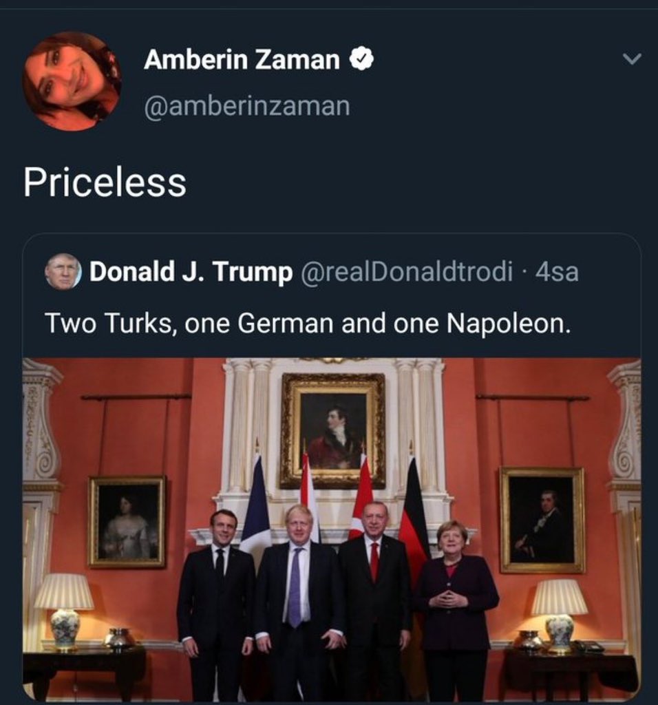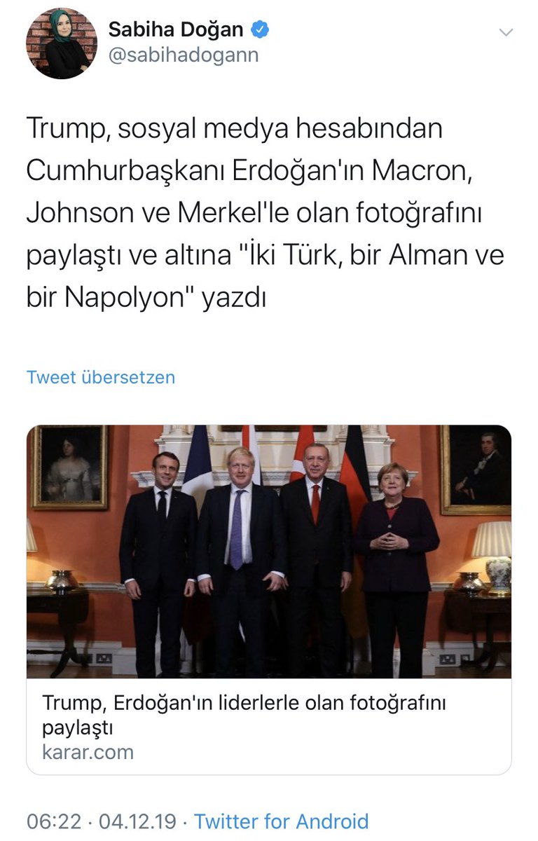 Londra’da gerçekleşen NATO Zirvesi’nin ardından, ABD Başkanı Donald Trump’ın Cumhurbaşkanı Erdoğan, Emmanuel Macron, Angela Merkel ve Boris Johnson’ın yer aldığı fotoğrafı “İki Türk, bir Alman ve bir Napolyon” (“Two Turks, one German and one Napoleon”) notuyla tweetlediği yönünde asılsız bir iddia dolaşıma girdi. “Donald J. Trump” mahlaslı parodi bir hesaptan yapılan paylaşımın Başkan Trump’ın kişisel hesabından yapıldığı yönündeki yanlış algı bu duruma yol açtı.