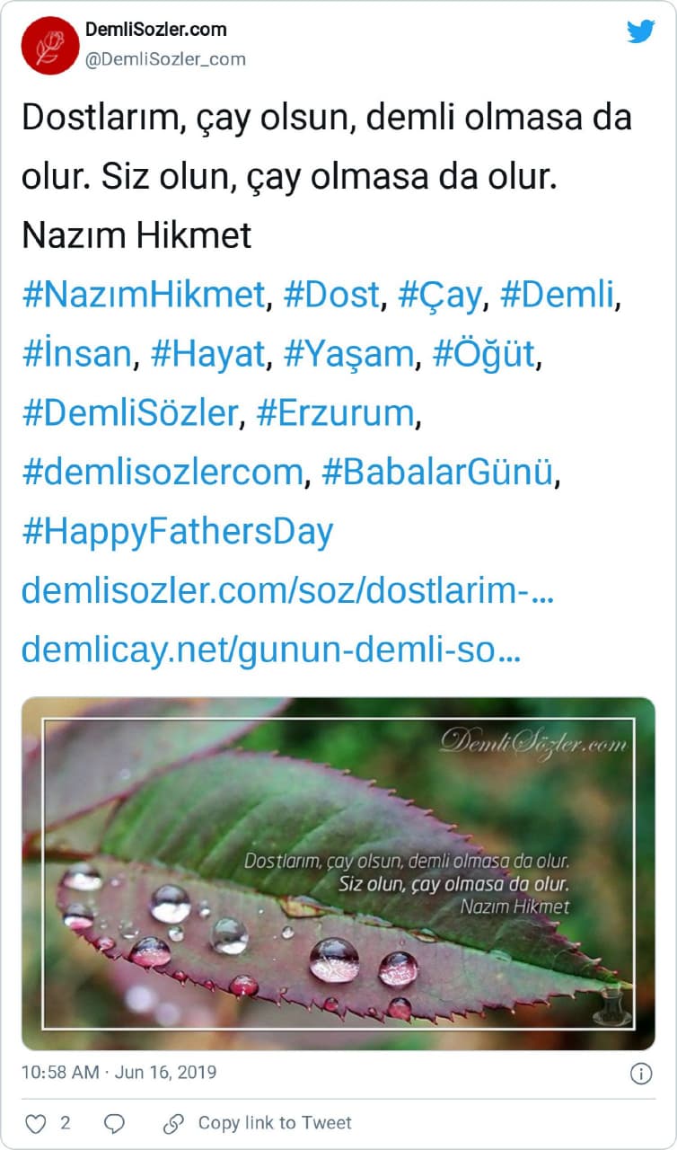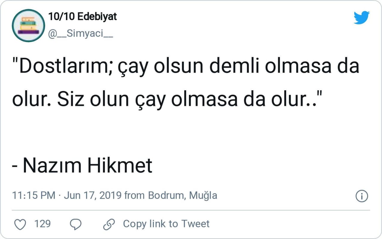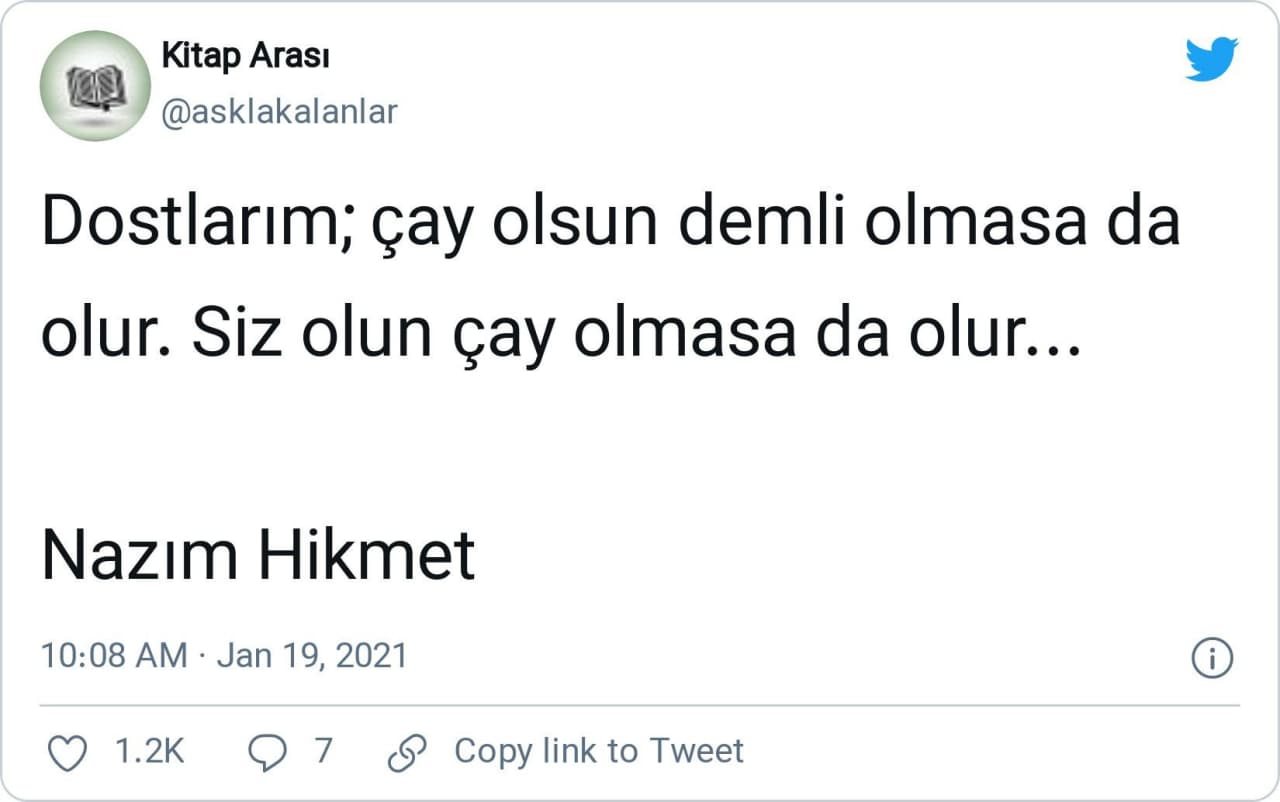 Ancak incelemeye konu olan “Dostlarım çay olsun, demli olmasa da olur. Siz olun, çay olmasa da olur” şeklindeki söz, Nâzım Hikmet’e ait değil. Şairin tüm şiirlerinin toplandığı “Bütün Şiirleri” isimli kitapta yaptığımız taramalar sonucunda ifadelere dair bir iz bulamadık.