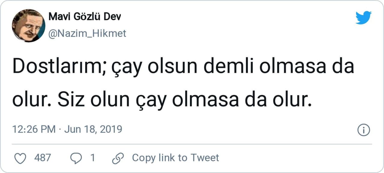 “Dostlarım çay olsun, demli olmasa da olur. Siz olun, çay olmasa da olur” sözünün Nâzım Hikmet’e ait olduğu iddiasına dair bir hayli örneğe rastlamak mümkün; birkaçına göz atalım: