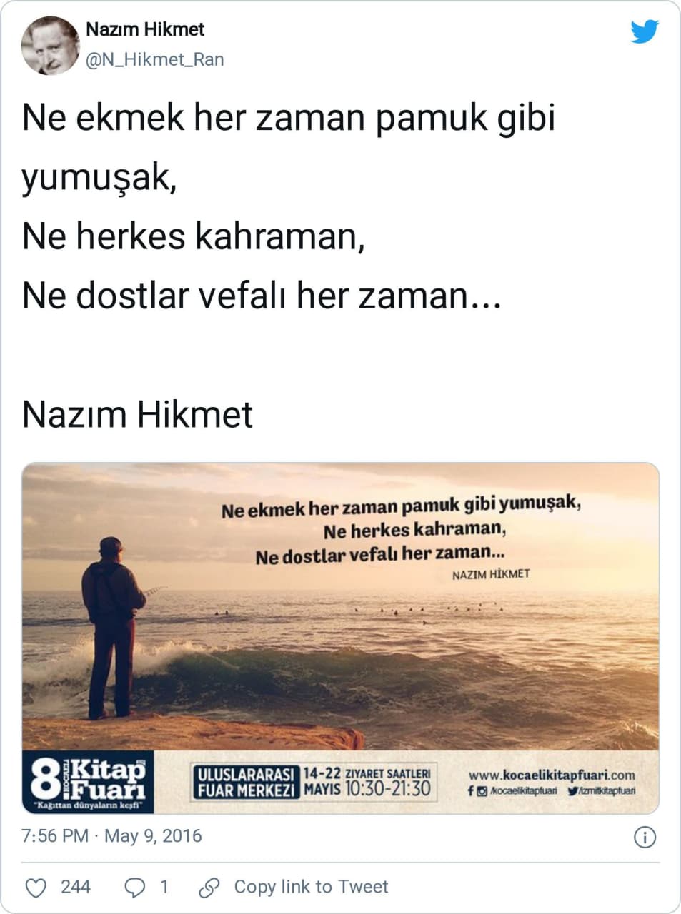 “Ne ekmek her zaman pamuk gibi yumuşak/ Ne herkes kahraman, ne dostlar vefalı her zaman” ifadesi gerçekten de Nâzım Hikmet’e ait; dizeler, şairin “Yapıyla Yapıcılar” isimli şiirinde yer alıyor.