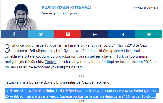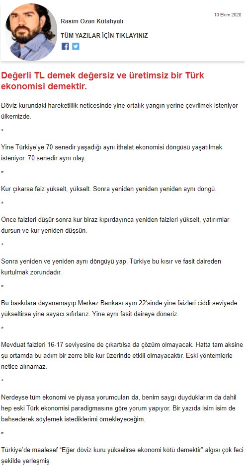 İlaveten, Türk lirasındaki değer kaybını zaman içerisinde farklı yorumlayan yazarlara rastlamak mümkün. Örneğin, Rasim Ozan Kütahyalı, 2013 Mayıs-Aralık arasındaki süreçte kurun 1,74’ten 2,47’e çıkması nedeniyle kur zararı hesabı yaparken, son dönemdeki TL’deki değer kayıpları için “değerli bir TL değersiz bir Türk ekonomisi olmaya devam etmek demektir” yorumunda bulunmuştu.