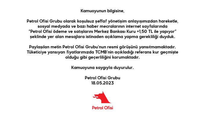 Böylesi bir ortamda sosyal medya platformlarında Petrol Ofisi Grubu’nun ödeme ve satışlarını “Merkez Bankası kuru + 1.50 TL” ile yapacağını duyurduğu iddiası dolaşıma girdi.