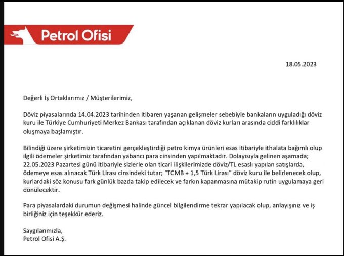Bilindiği üzere şirketimizin ticaretini gerçekleştirdiği petro kimya ürünleri esas itibariyle ithalata bağımlı olup ilgili ödemeler şirketimiz tarafından yabancı para cinsinden yapılmaktadır. Dolayısıyla gelinen aşamada; 22.05.2023 Pazartesi günü itibariyle sizlerle olan ticari ilişkilerimizde döviz/TL esaslı yapılan satışlarda, ödemeye esas alınacak Türk Lirası cinsindeki tutar; “TCMB + 1,5 Türk Lirası” döviz kuru ile belirlenecek olup, kurlardaki söz konusu fark günlük bazda takip edilecek ve farkın kapanmasına mütakip rutin uygulamaya geri dönülecektir.