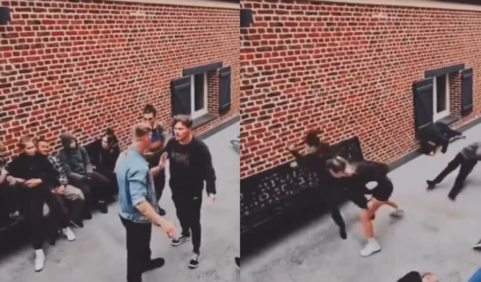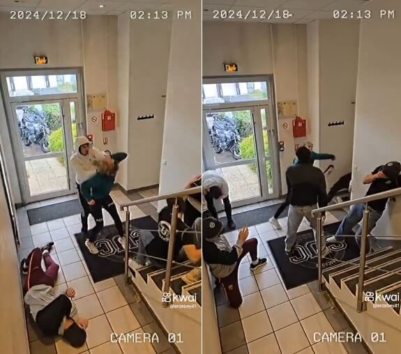 Sosyal medyada “harbi kız” ifadesiyle paylaşılan, binadan çıkmak üzereyken çantasını alan erkeği ve yanındakileri döven kadının görüldüğü video da Campus Univers Cascades adlı grup tarafından hazırlanmış.