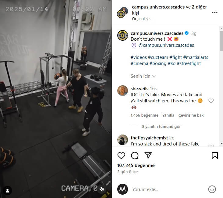 Spor salonunda çalışan kadının erkeğin ‘dostum o hareketi yanlış yapıyorsun’ ‘o hareket öyle yapılmaz kardeşim’ tacizinde bulunan erkeği dövdüğü içerik de Campus Univers Cascade adlı gruba ait.