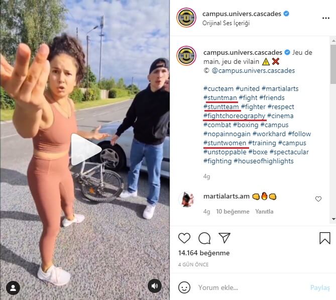 Söz konusu gönderinin dublörlük ve koreografi ile ilgili etiketlerle birlikte paylaşıldığı görülebiliyor.
