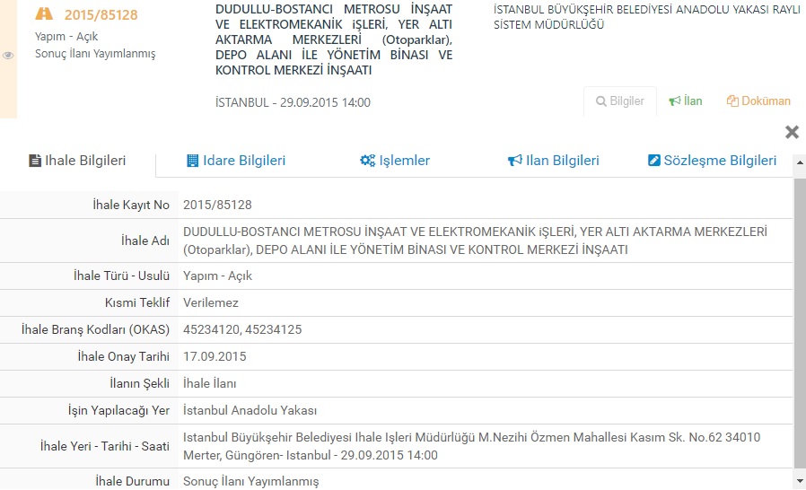 “Dudullu – Bostancı Metrosu İnşaat ve Elektronik İşleri, Yeraltı Aktarma Merkezleri (Otoparklar), Depo Alanı ile Yönetim Binası ve Kontrol Merkezi İnşaatı” İstanbul Büyükşehir Belediyesi Raylı Sistem Daire Başkanlığı Anadolu Yakası Raylı Sistem Müdürlüğü tarafından 758.774.349,25 Avroluk yaklaşık maliyetle ihale edilmişti.