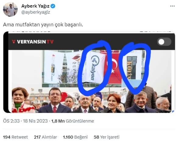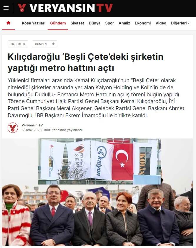 Örneğin, Veryansıntv.com İstanbul’un yeni metro hattının açılış törenini “Kılıçdaroğlu ‘Beşli Çete’deki şirketin yaptığı metro hattını açtı” başlığıyla, törende Kemal Kılıçdaroğlu, Meral Akşener, Ahmet Davutoğlu, Ekrem İmamoğlu ve Canan Kaftancıoğlu’nun görüldüğü fotoğrafın üzerine Kalyon Holding ve Kolin İnşaat’ın flamalarının görüldüğü görseli ekleyerek paylaştı.