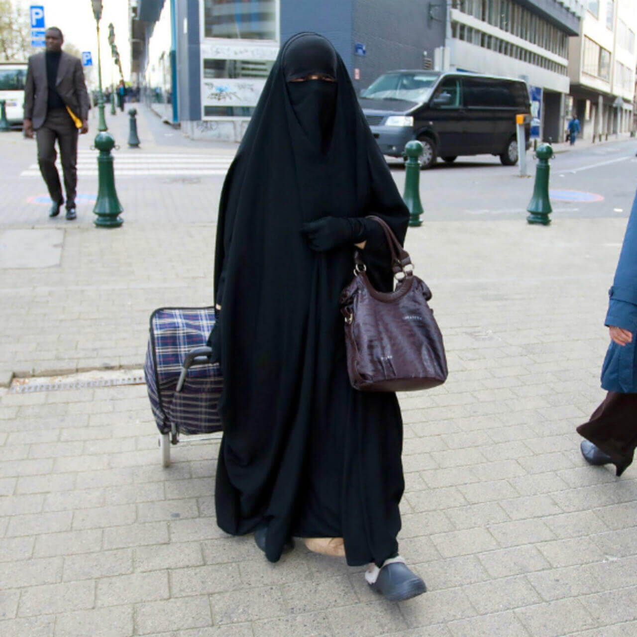 1950 ve 2024 yıllarında İstanbul’da kadınların giyimini yansıttığı iddiasıyla paylaşılan kolajdaki siyah renk burka giyen ve pazar arabası taşıyan kadının görüldüğü fotoğraf 2010 yılında Belçika’da kaydedilmiş.