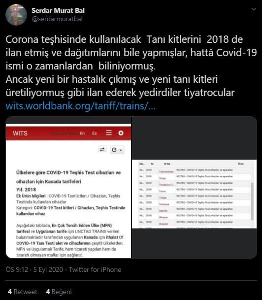 “Corona teşhisinde Tanı kitlerini kullanacaklarını 2018 de ilan etmiş ve dağıtımını yapmışlar, hattâ Covid-19 ismi o zamanlarda dahi biliniyor Fakat hastalığa yeni isim vermiş ve yeni tanı kitleri üretiliyormuş gibi ilan ettiler Tam bir iblis tiyatrosu…”