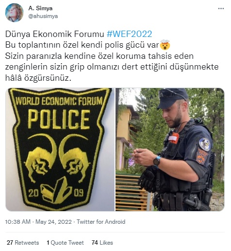 “Dünya Ekonomik Forumu #WEF2022 Bu toplantının özel kendi polis gücü var🤯 Sizin paranızla kendine özel koruma tahsis eden zenginlerin sizin grip olmanızı dert ettiğini düşünmekte hâlâ özgürsünüz.”