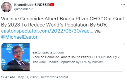 İLAVE: 2023 yılı yaz aylarında Pfizer CEO’su Albert Bourla’nın konuşması kesilerek dünya nüfusunu yarıya indirme planından bahsettiği iddiası yeniden dolaşıma sokulmuş. Bourla konuşmasında, ilaçlarını almaya gücü yetmeyen insan sayısını %50 azaltmaktan bahsediyor. Orijinal cümle “dünyada ilaçlarımıza gücü yetmeyen insan sayısını %50 azaltırdık” (“we would reduce the number of people in the world who cannot afford our medicines by 50%.”) şeklinde.