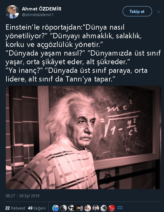 "Bir Einstein teorisine göre dünyada; -Üst sınıf yaşar, -Orta sınıf şikayet eder, -Alt sınıf şükredermiş. -Üst sınıf paraya, -Orta sınıf lidere, -Alt sınıf tanrıya taparmış."