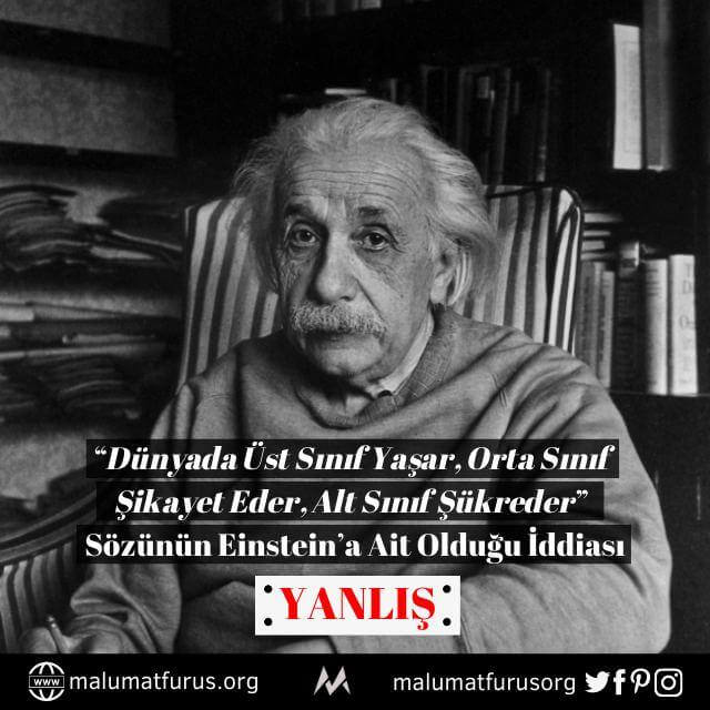 Yukarıdaki anlatıda geçen “Delilik, Aynı Şeyi Tekrar Tekrar Yapıp Farklı Sonuçlar Beklemektir” sözünün Albert Einstein’a ait olduğu iddiasının doğru olmadığını aktarmıştık. Benzer şekilde, her ne kadar yine sahipliği Einstein’a atfedilse de, “dünyada, üst sınıf yaşar, orta sınıf şikayet eder, alt sınıf şükreder… Üst sınıf paraya, orta sınıf lidere, alt sınıf Tanrı’ya tapar…” vecizesi Einstein’a ait değil.